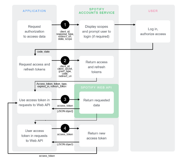 공식 문서 및 다른 사람들의 코드를 참고했을 때 대부분 접근 권한을 사용자에게 주고, 사용자에게 권한이 있는 경우 요청이 처리되도록 하였다. Spotify 계정으로 사용자가 로그인을 하면 Access Token을 발급받고 이후 서비스를 사용하는 방식으로 이루어지기 때문이다.