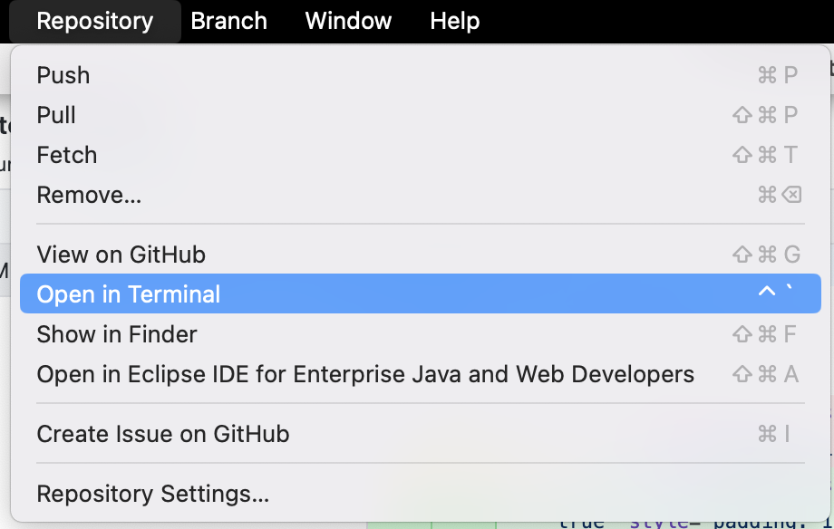 리포지토리를 가져온 것을 확인하면 Repository > Open in Terminal을 실행한다. (Windows - Open in Git Bash)
