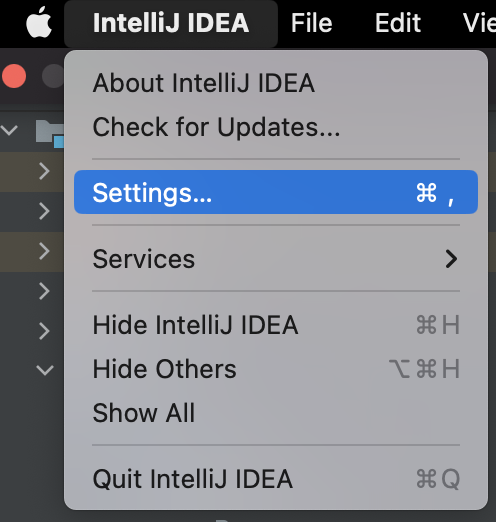 상단 메뉴바에서 IntelliJ IDEA > Settings에 들어간다.