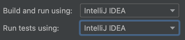 Build and run using과 Run tests using이 기본값인 Gradle로 되어있다.